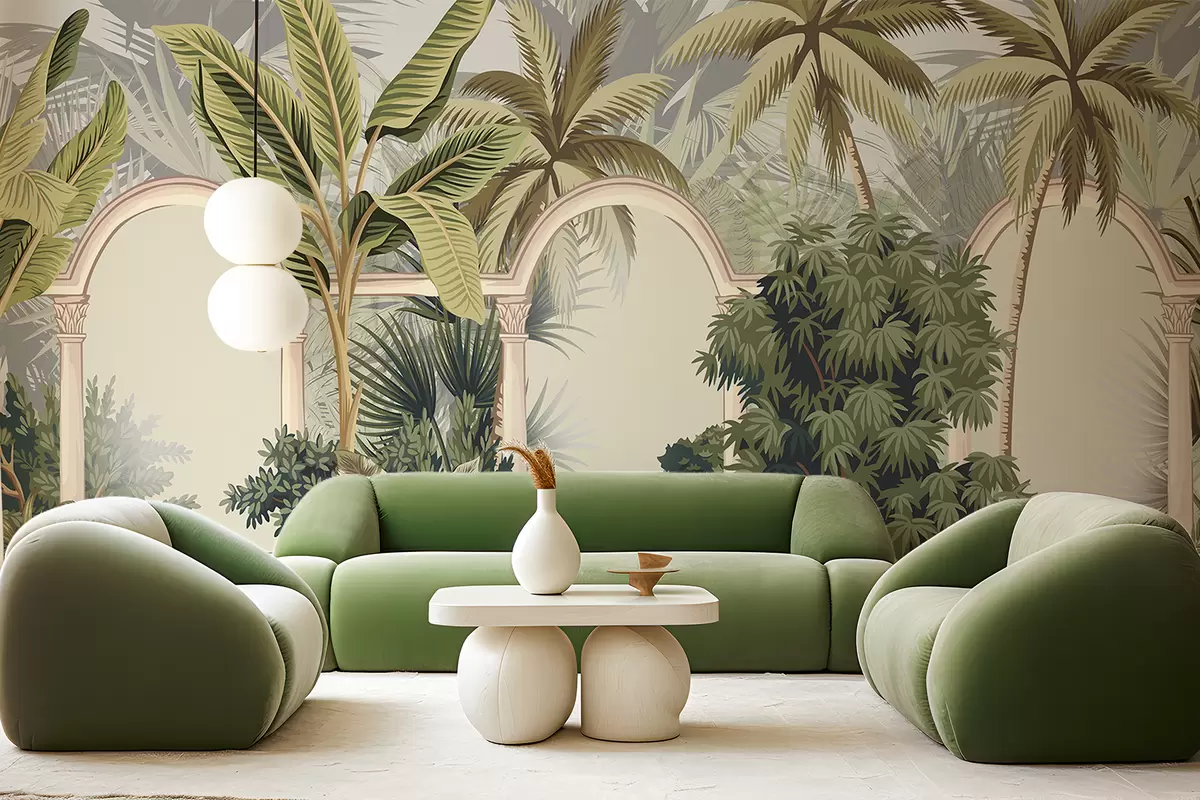 Fotobehang Bogen met tropisch landschap, weelderige palmbomen en ander gebladerte tegen een lichte achtergrond N° w08306