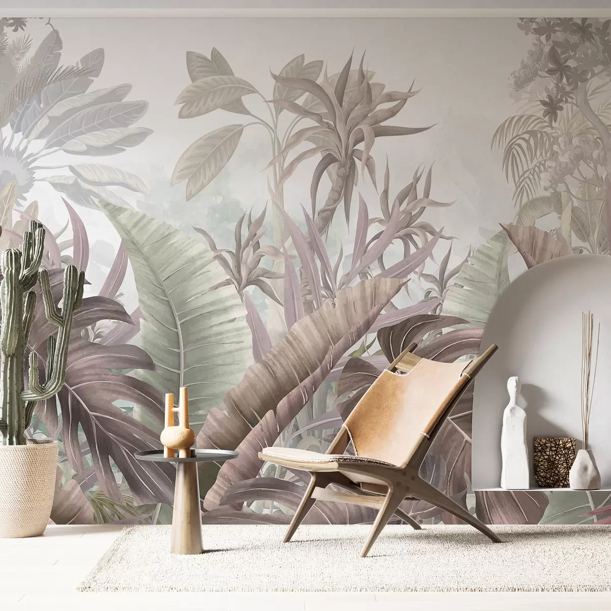Fotobehang Een tropisch oerwoud met grote palmbladeren en exotische planten in grijs-, wit- en beigetinten N° w08307