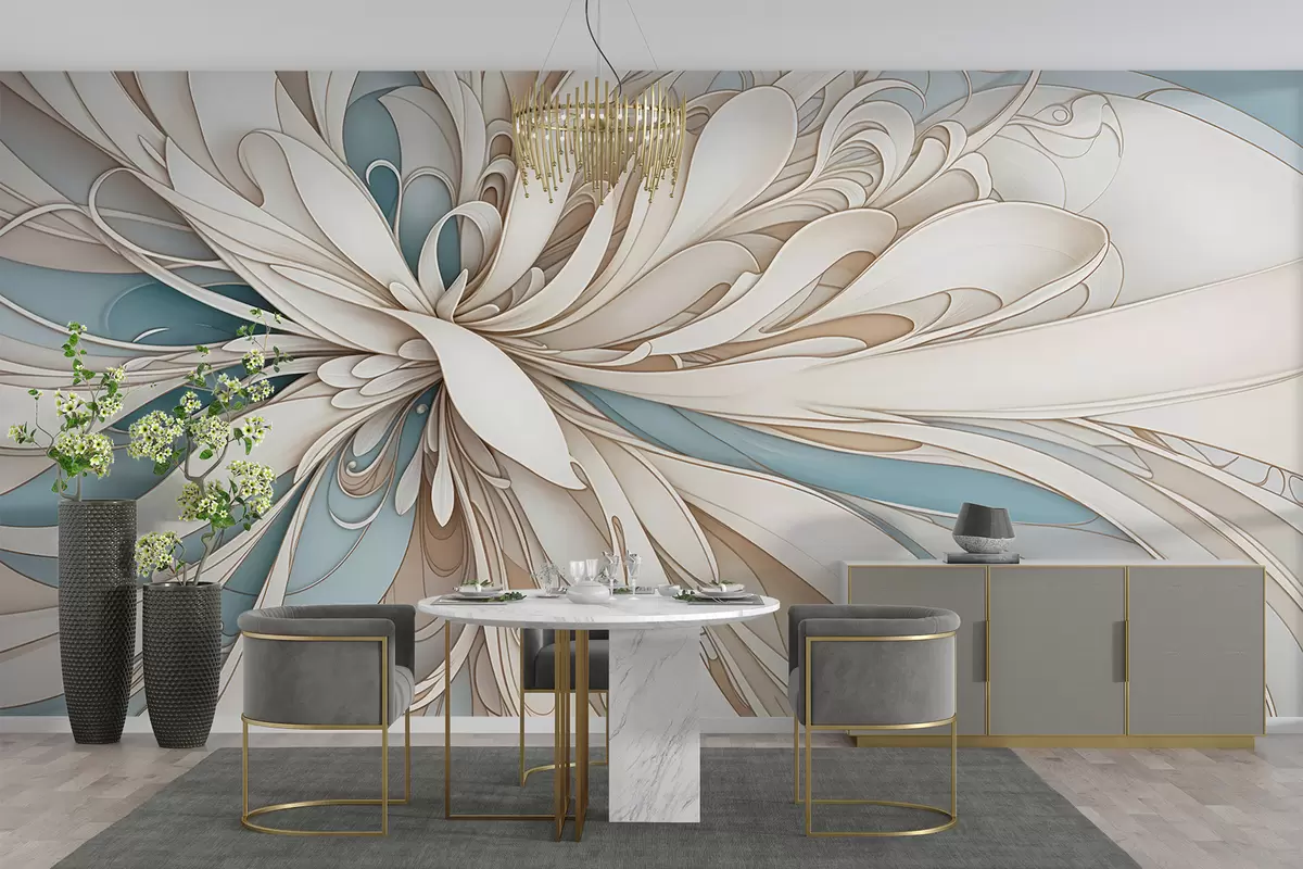 Fotobehang Abstract bloemenpatroon met wervelende, organische vormen in beige, bruine en blauwe tinten met een lichte achtergrond N° w08311