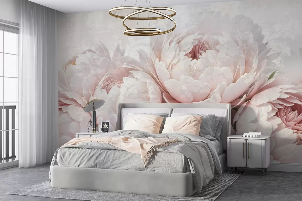 Fotobehang Zachtroze pioenrozen met delicate bloemblaadjes tegen een lichte vintage achtergrond met textuur N° w08312