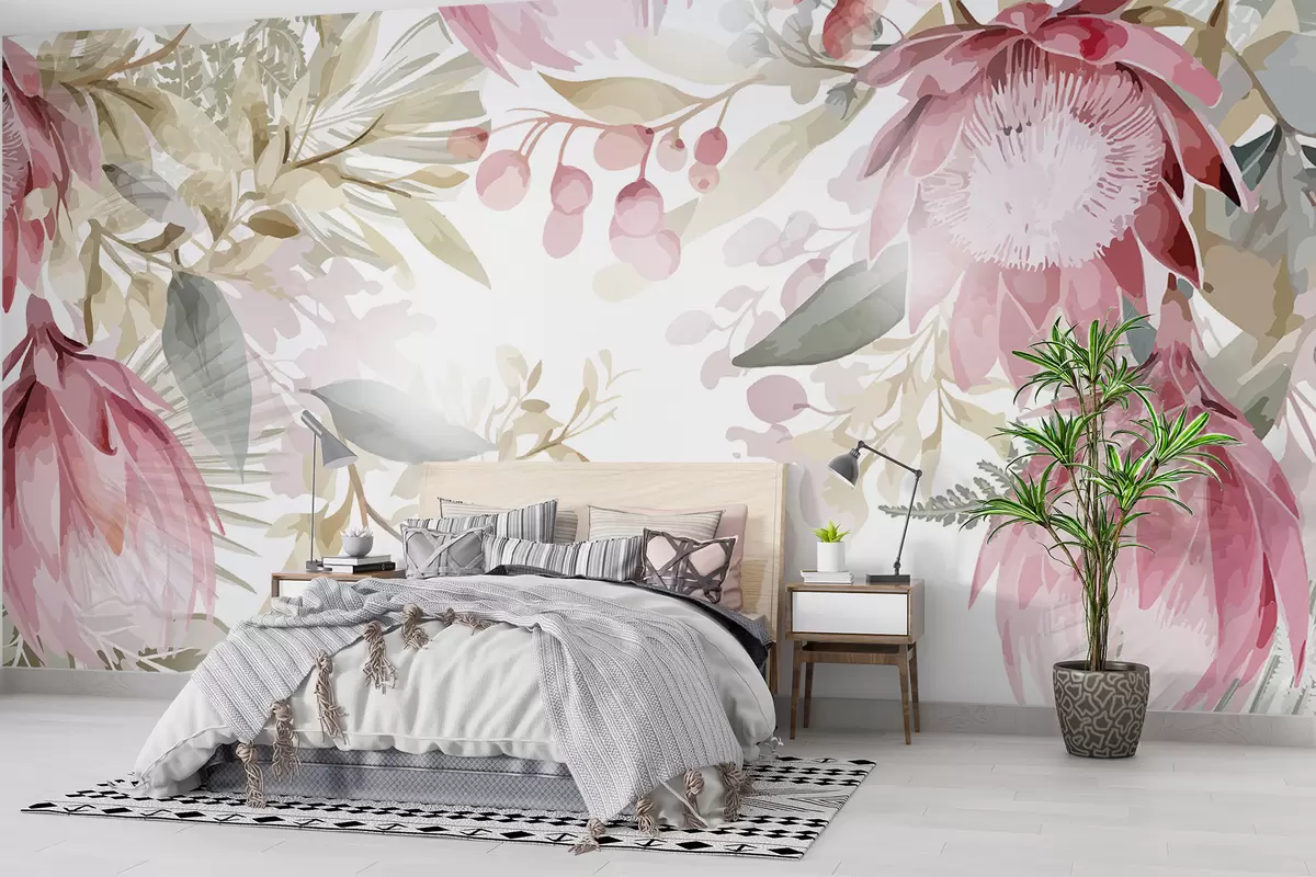Fotobehang Grote roze en witte transparante protea's met weelderige groene bladeren tegen een lichte achtergrond N° w08315