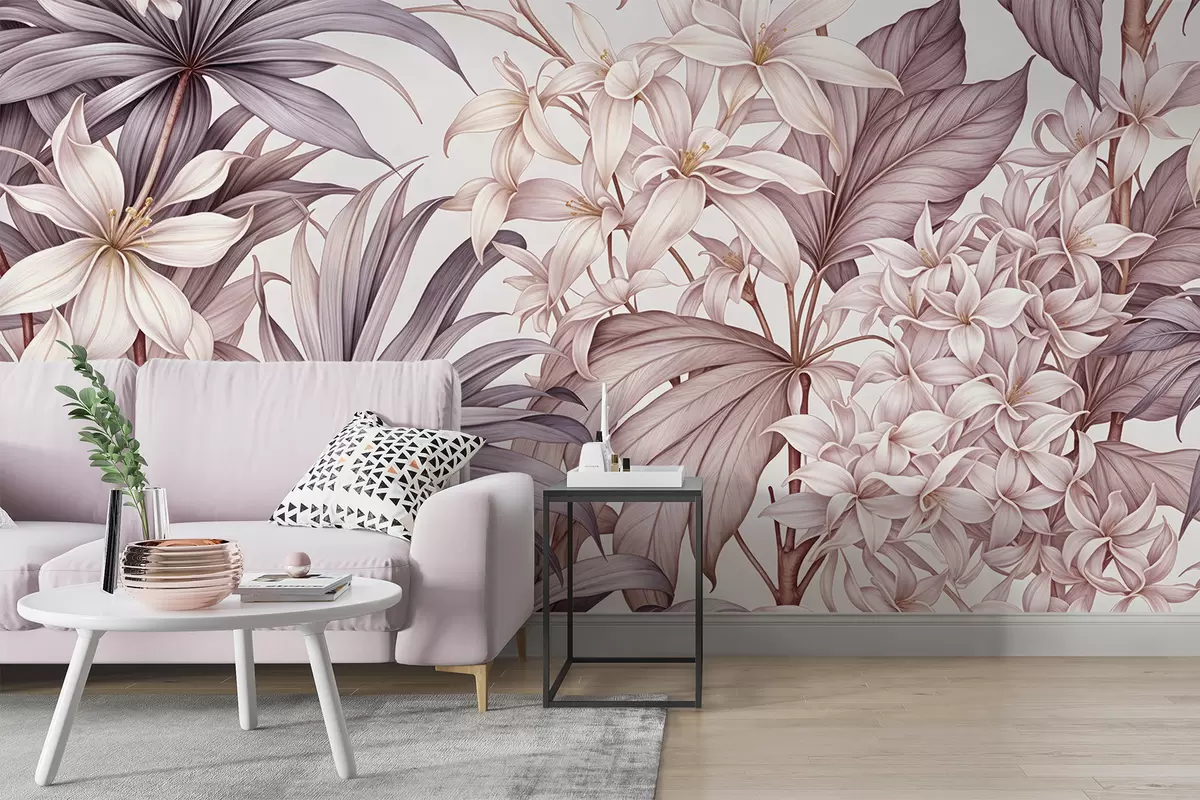 Fotobehang Een tropische bloemenprint met grote witte en lichtroze bloemen, bordo bladeren en een neutrale achtergrond w08318v1