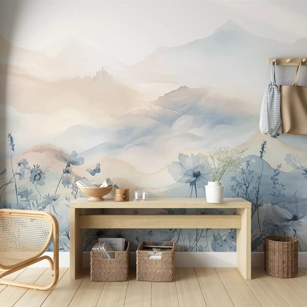 Fotobehang Een sereen landschap met een mistige bergketen op de achtergrond, omringd door een veld met delicate blauwe bloemen N° w08339