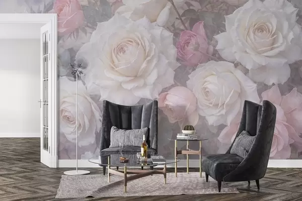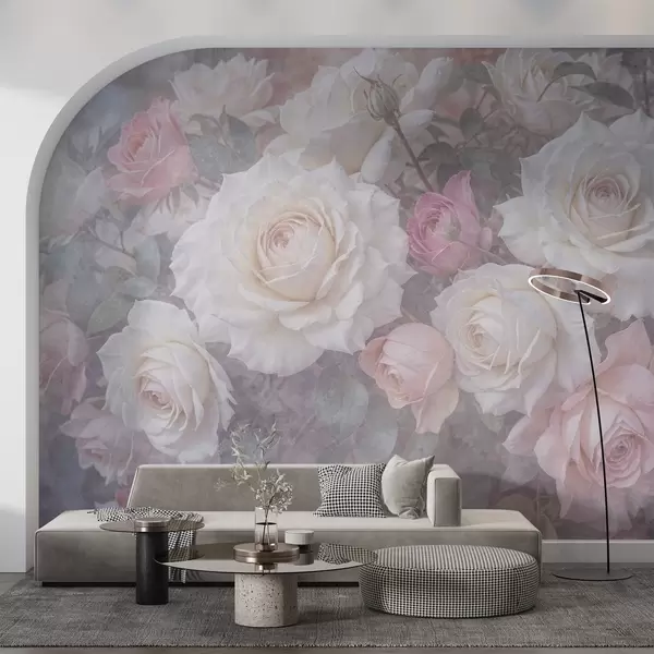Fotobehang Zachte, pastelkleurige rozen en pioenrozen tegen een vage, mistig grijze textuurachtergrond N° w08352