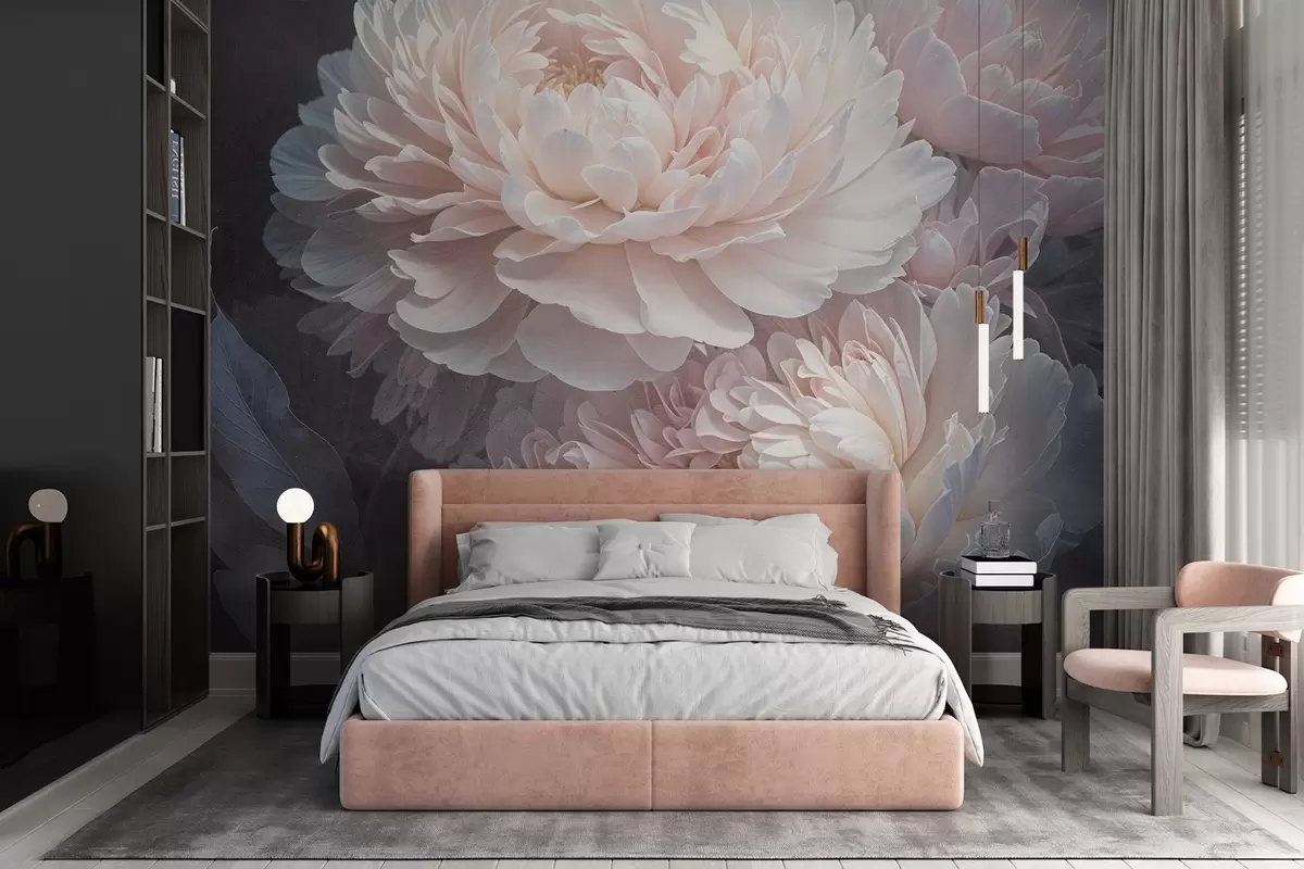 Fotobehang Een close-up van twee grote, delicate roze pioenrozen met zachte, pluizige bloemblaadjes en bladeren tegen een onscherpe achtergrond N° w08382