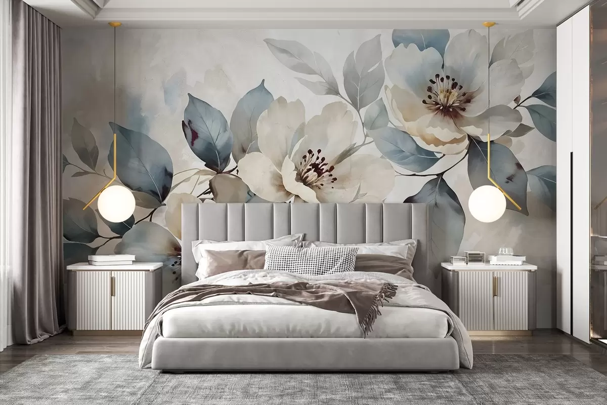 Fotobehang Delicaat bloemstuk met aquarelstructuur in wit en blauw, met zachte bloemblaadjes en hartjes N° w08401