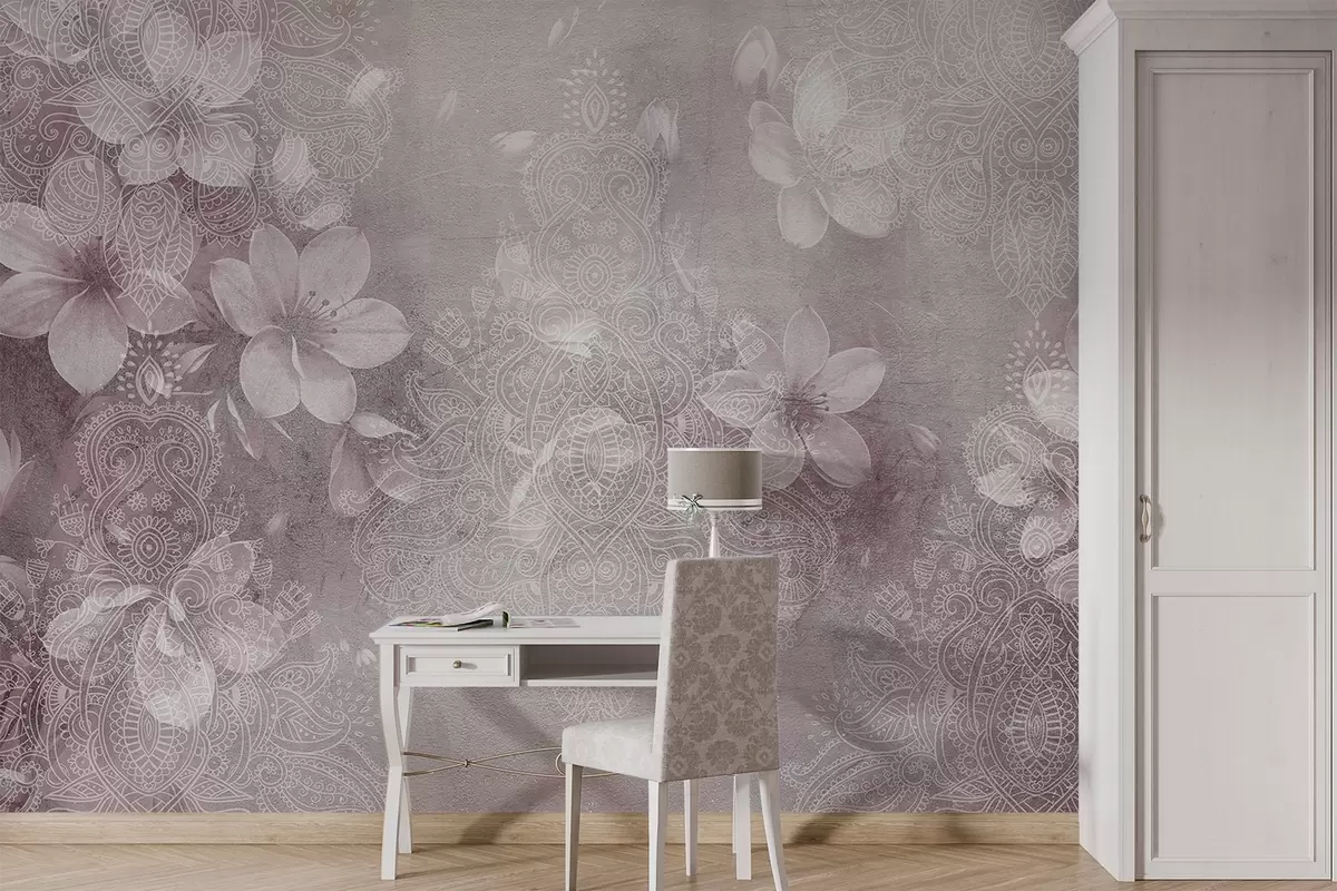 Fotobehang Zachte focus tekening van delicate witte bloemen op een wazige getextureerde kant bordo achtergrond w08405v2