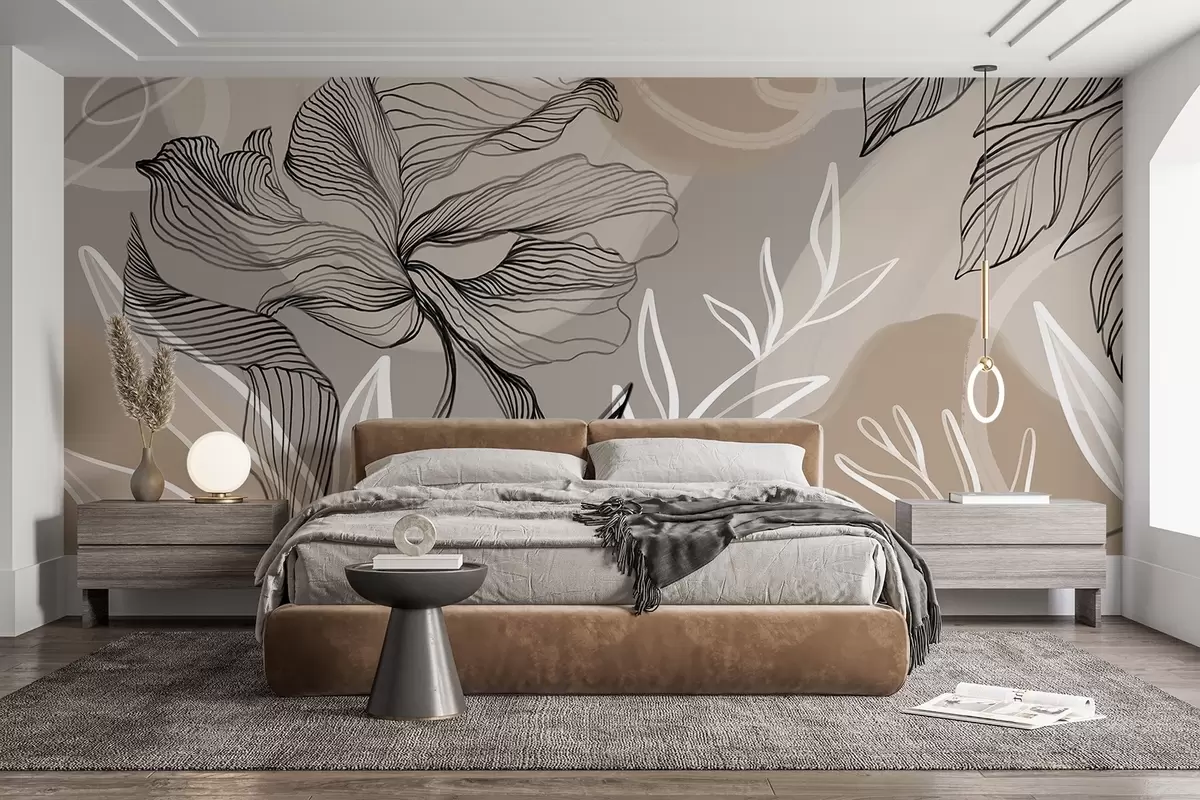 Fotobehang Elegante bloemenprint met grote abstracte lijnbloemen en bladeren in grijstinten en beige op een lichte achtergrond N° w08413