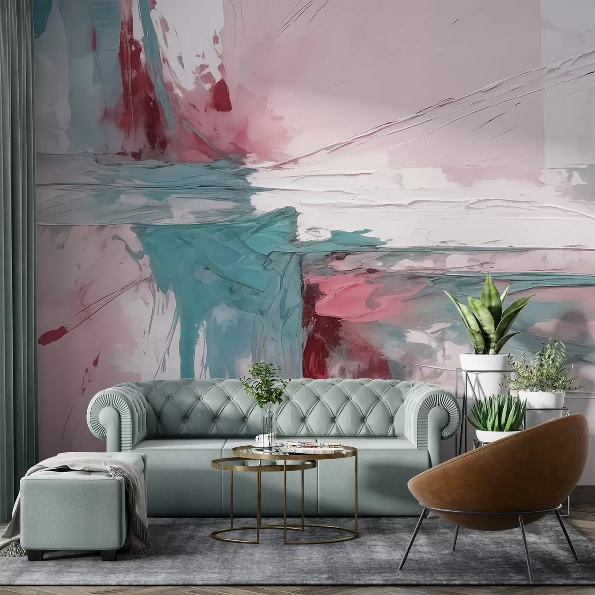 Fotobehang Minimalistische abstracte kunstcompositie met krachtige penseelstreken van roze, blauwe en witte verf N° w08414v1