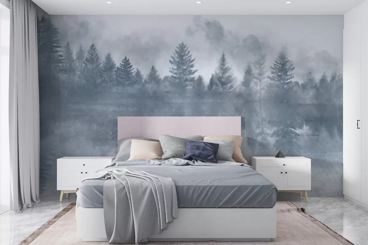 Fotobehang Een sereen landschap met een bevroren meer omringd door een dicht dennenbos, met een nevelige, mistige sfeer N° w08415