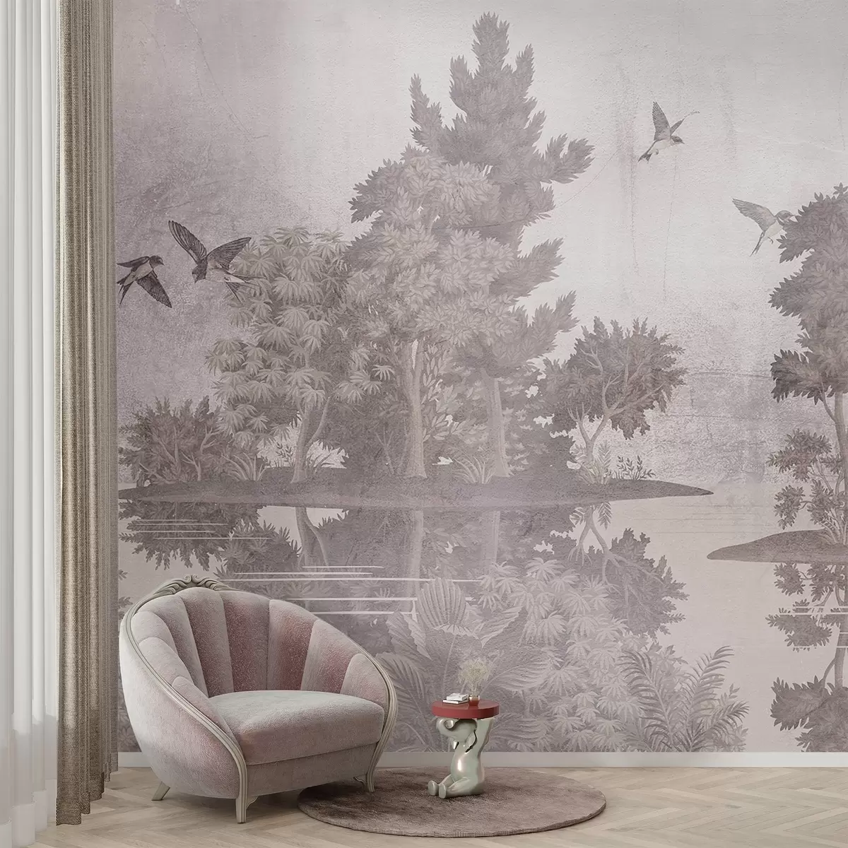 Fotobehang Een print van een boslandschap met een meer omringd door dennenbomen en ander gebladerte op een beige textuurachtergrond N° w08426