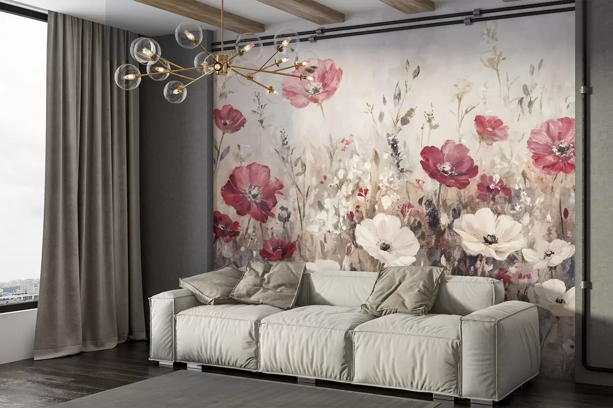 Fotobehang Een veld met levendige rode en witte bloemen tegen een zachte, wazige achtergrond in olieverfstijl N° w08438