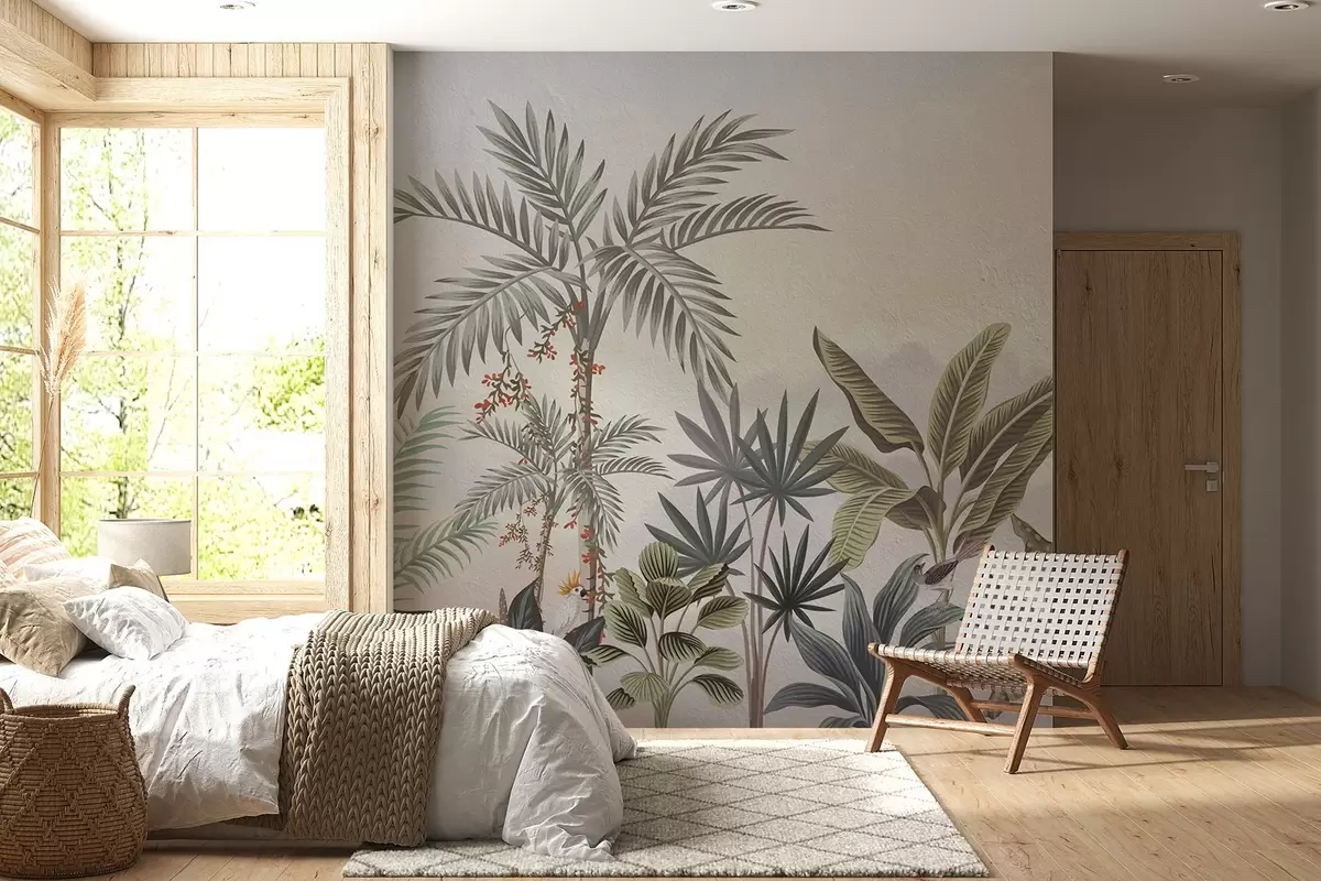 Fotobehang Tropische jungle met palmen en kleurrijke vogels N° w08496