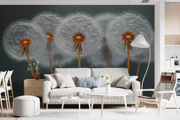 Fotobehang Luchtige paardenbloemen tegen een donkere natuurlijke achtergrond N° w08498