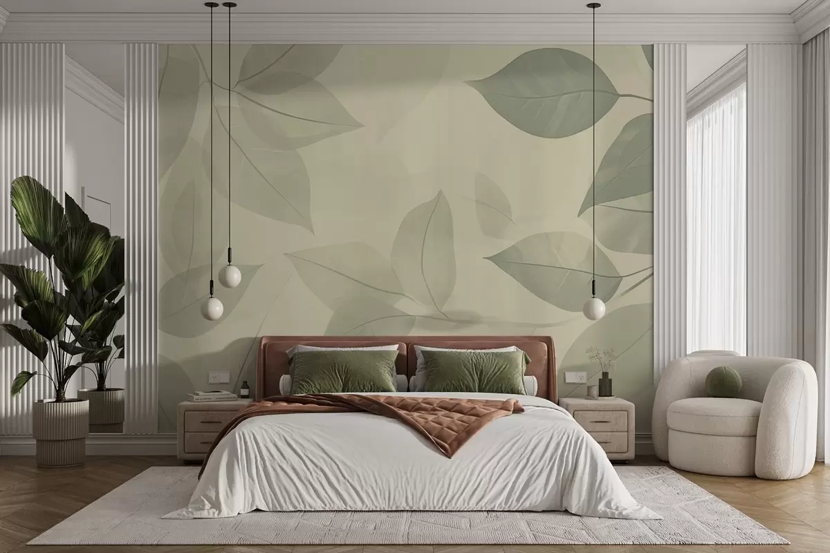 Fotobehang Takken met groene bladeren op een zachtbeige achtergrond N° w08502v2