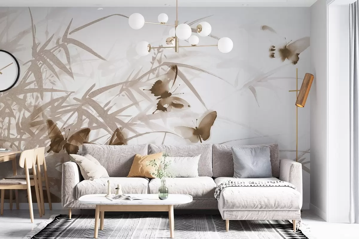 Fotobehang Texturale bamboebladeren en -stengels met vliegende bruine vlinders met transparante vleugels N° w08524v1