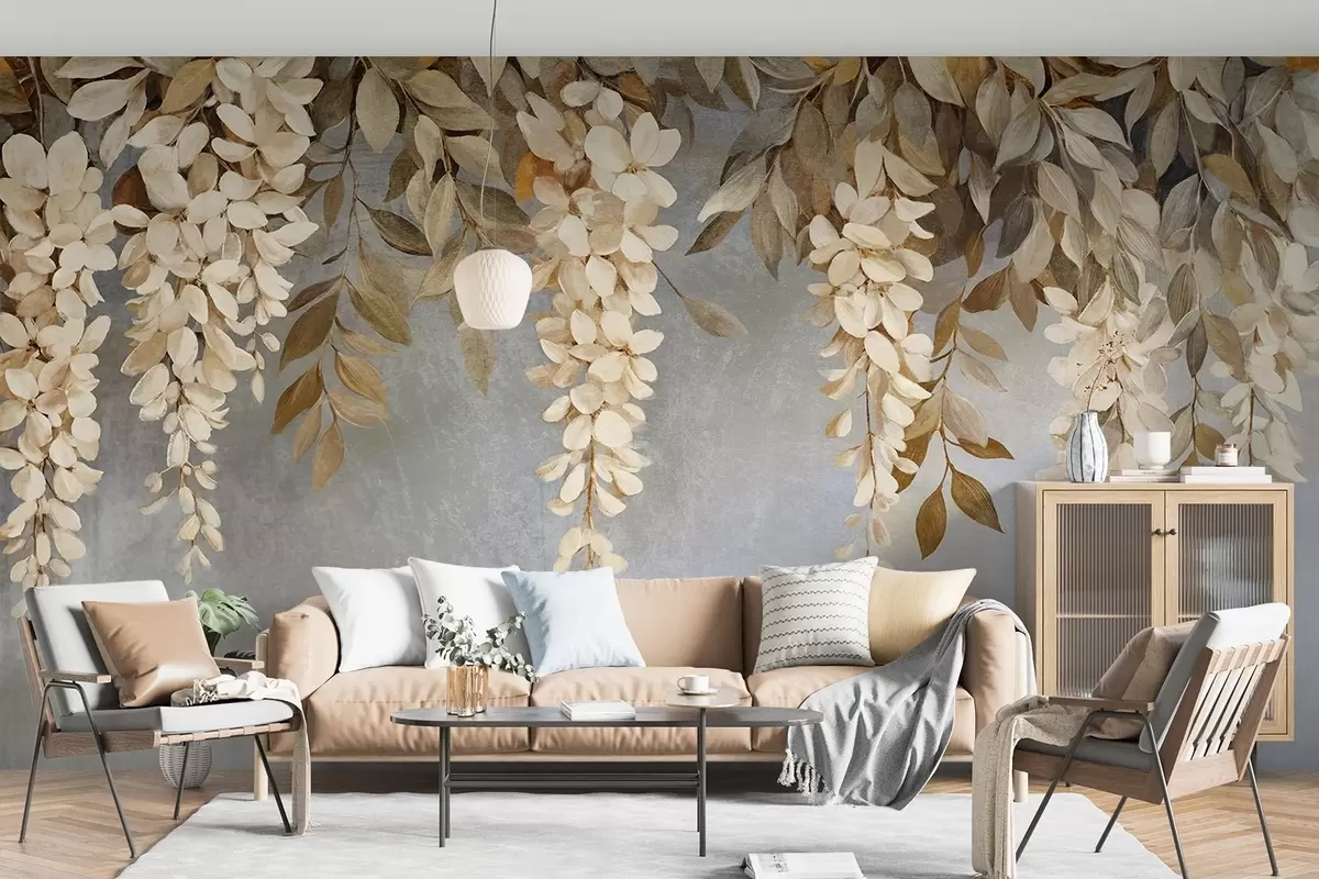 Fotobehang Delicate witte en lichtbeige blauweregen bloemen met bladeren tegen een zachtgrijze achtergrond N° w08531