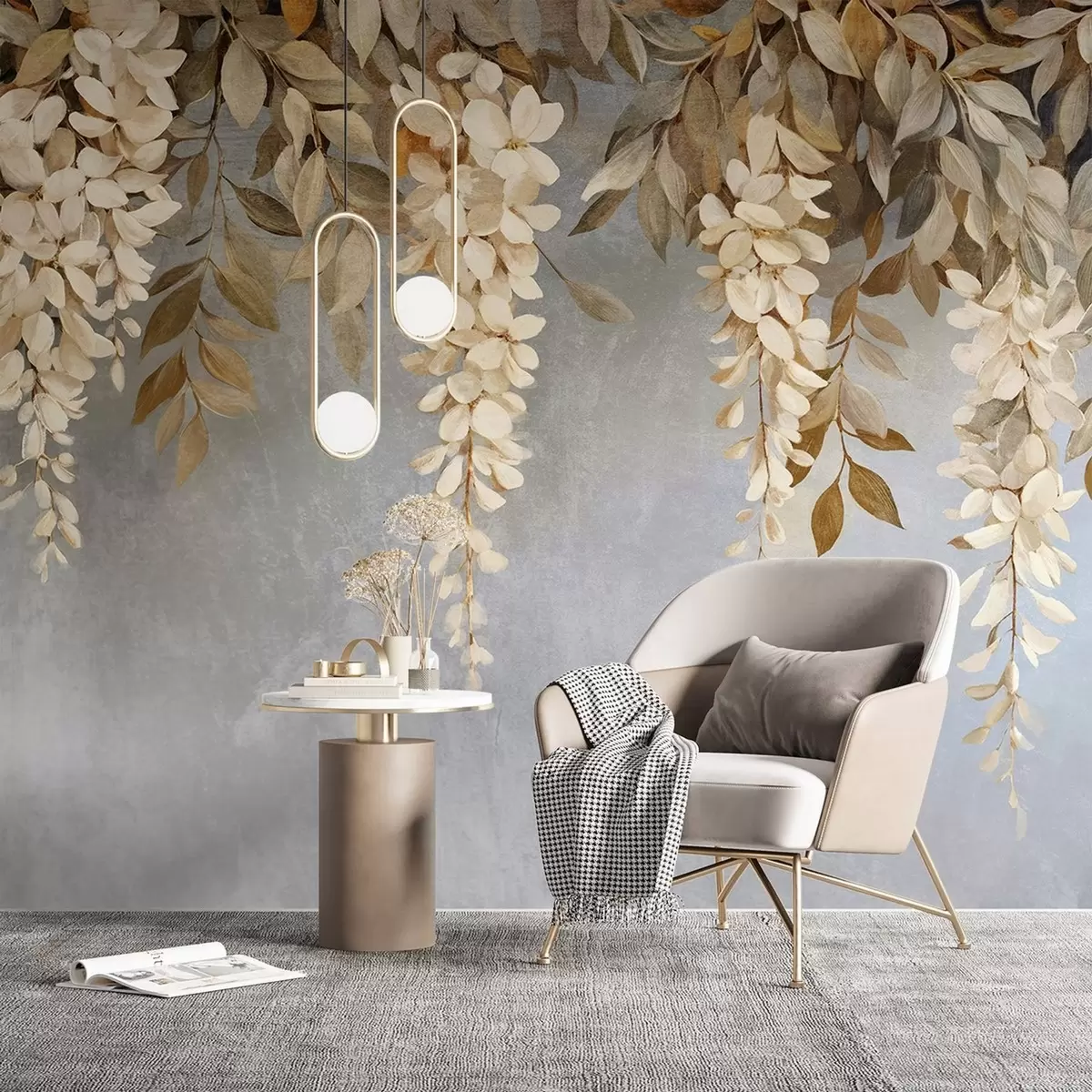 Fotobehang Delicate witte en lichtbeige blauweregen bloemen met bladeren tegen een zachtgrijze achtergrond N° w08531