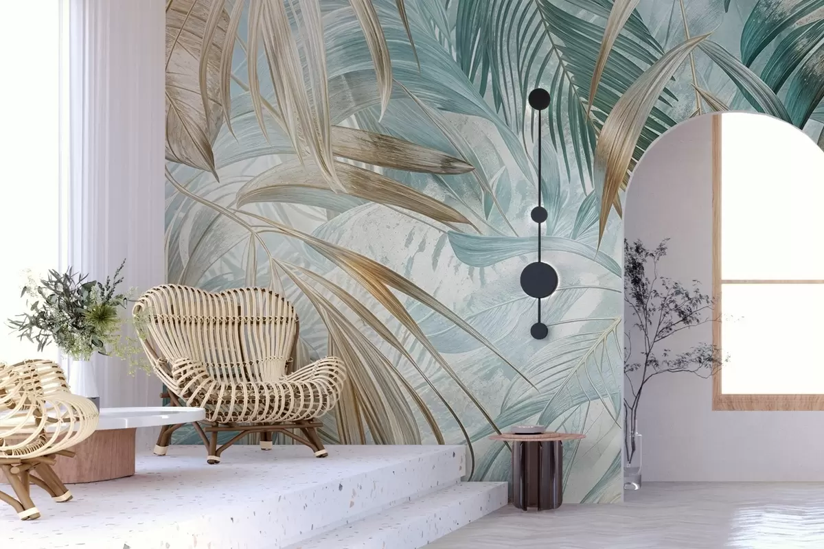 Fotobehang Een tropische abstracte bloemenprint met grote palmbladeren in blauw- en beigetinten creëert een weelderige sfeer N° w08532