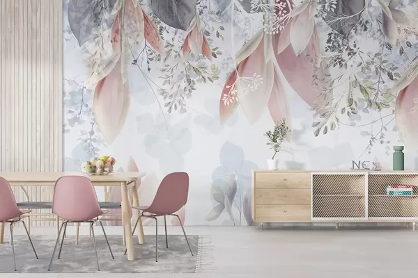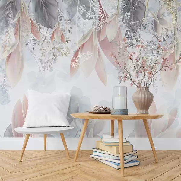 Fotobehang Zachte, pastelkleurige bloemenprint met delicate bloemblaadjes en bladeren in roze, witte en grijze tinten N° w08538