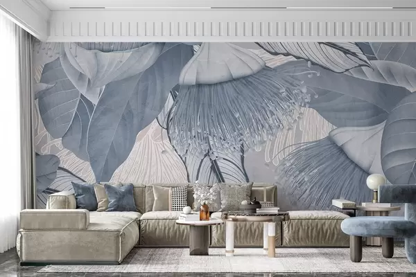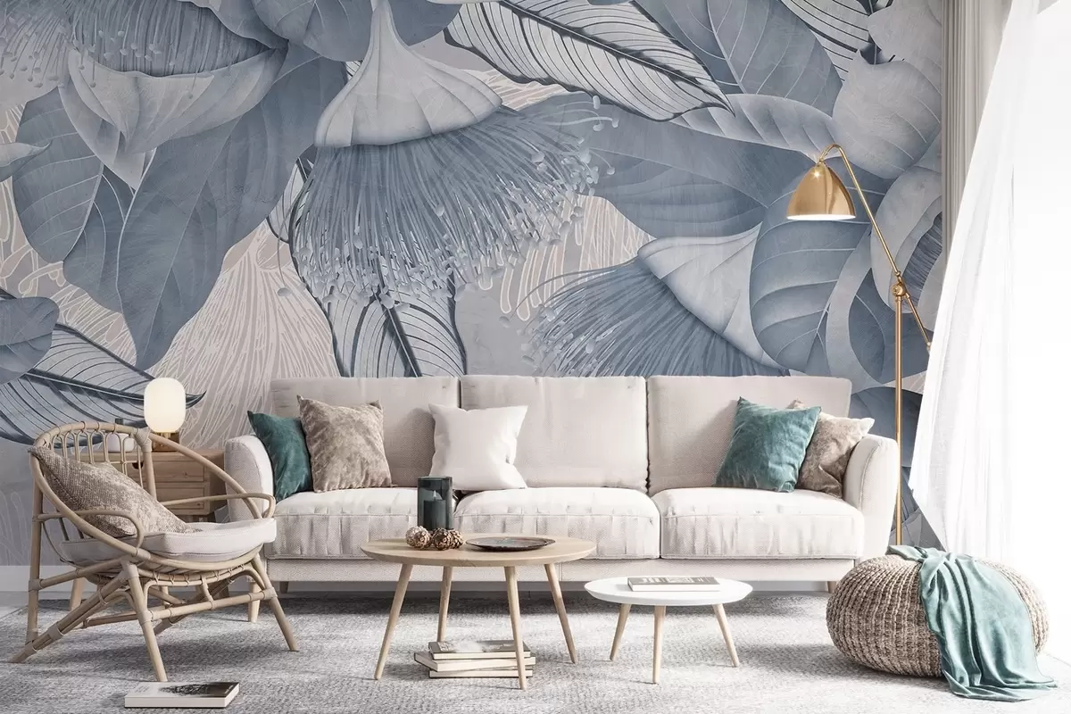 Fotobehang Botanische illustratie van grote, blauwe eucaliptusbloemen met lange meeldraden tegen een grijze en witte achtergrond N° w08539v1