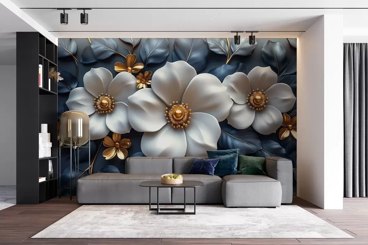Fotobehang Grote witte bloemen op een elegante blauwe achtergrond met bladeren N° w08559