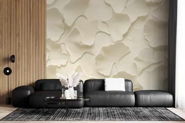 Fotobehang Stucco met delicaat reliëf van ginkgobladeren op een zachtbeige achtergrond N° w08560