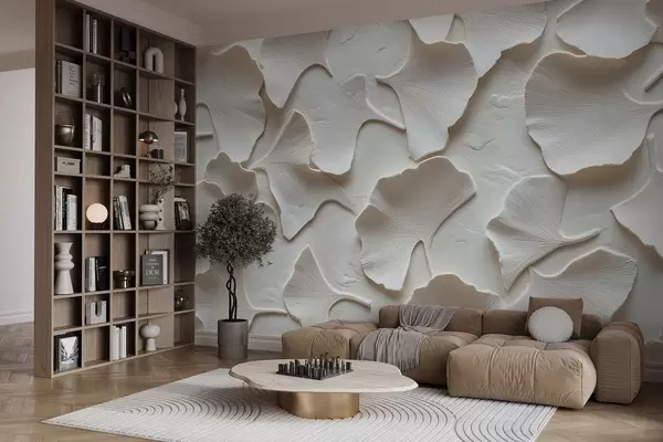 Fotobehang Stucco met delicaat reliëf van ginkgobladeren op een witte achtergrond N° w08560v1