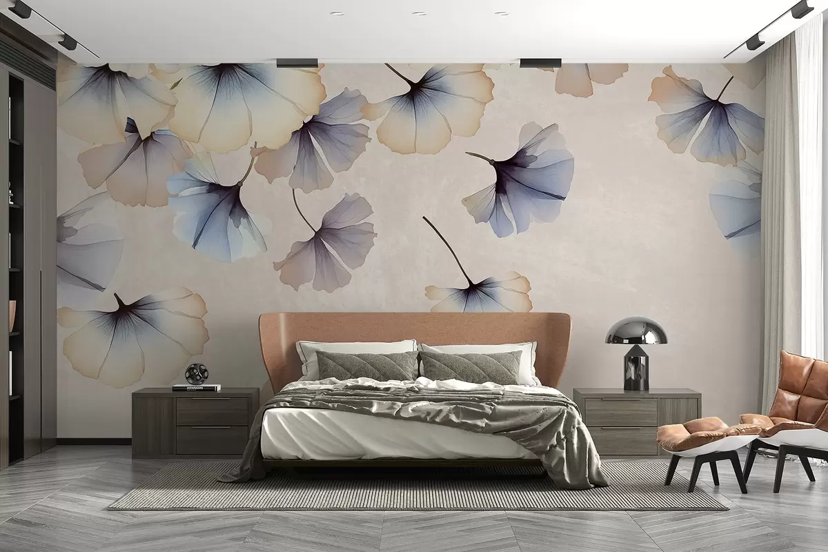 Fotobehang Pastelkleurige blauwe en beige ginkgobladeren met delicate bloemblaadjes die in de lucht zweven tegen een texturale achtergrond N° w08578
