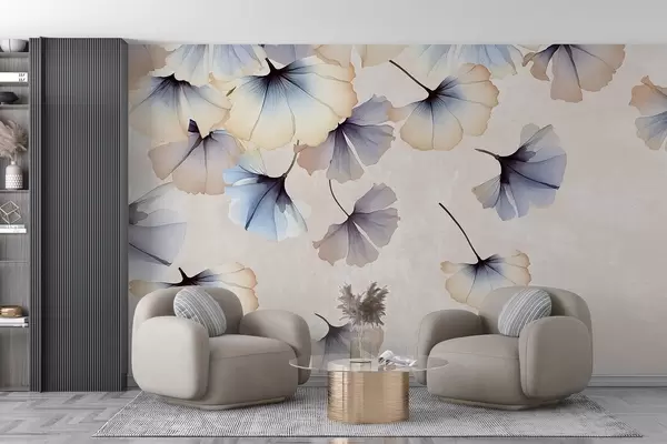 Fotobehang Pastelkleurige blauwe en beige ginkgobladeren met delicate bloemblaadjes die in de lucht zweven tegen een texturale achtergrond N° w08578