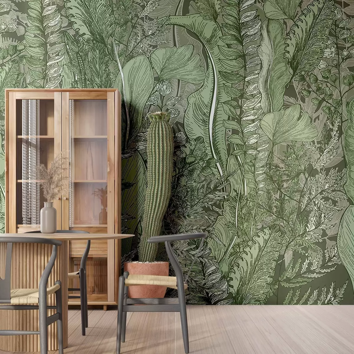 Fotobehang Een weelderig, groen bos met verschillende soorten varens, bladeren en gebladerte in groentinten N° w08579