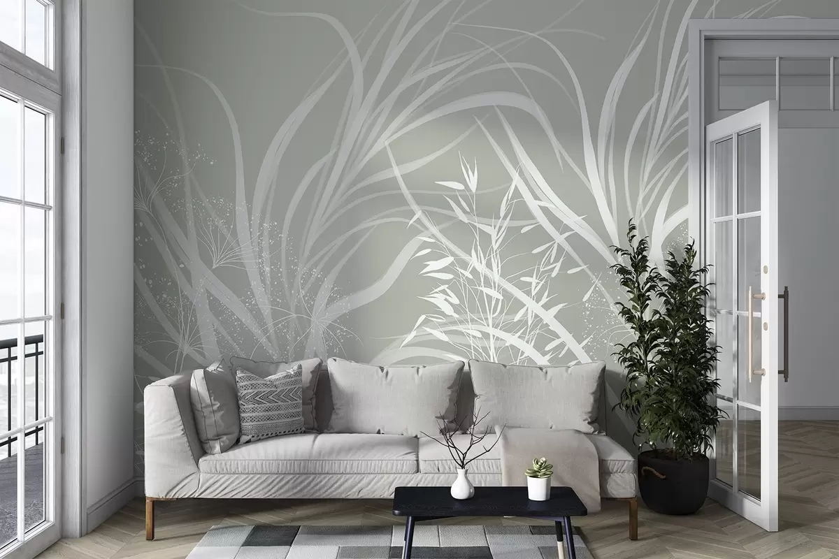 Fotobehang Delicate moderne minimalistische witte bloemenprint op een lichte pastelgroene achtergrond N° w08583v1