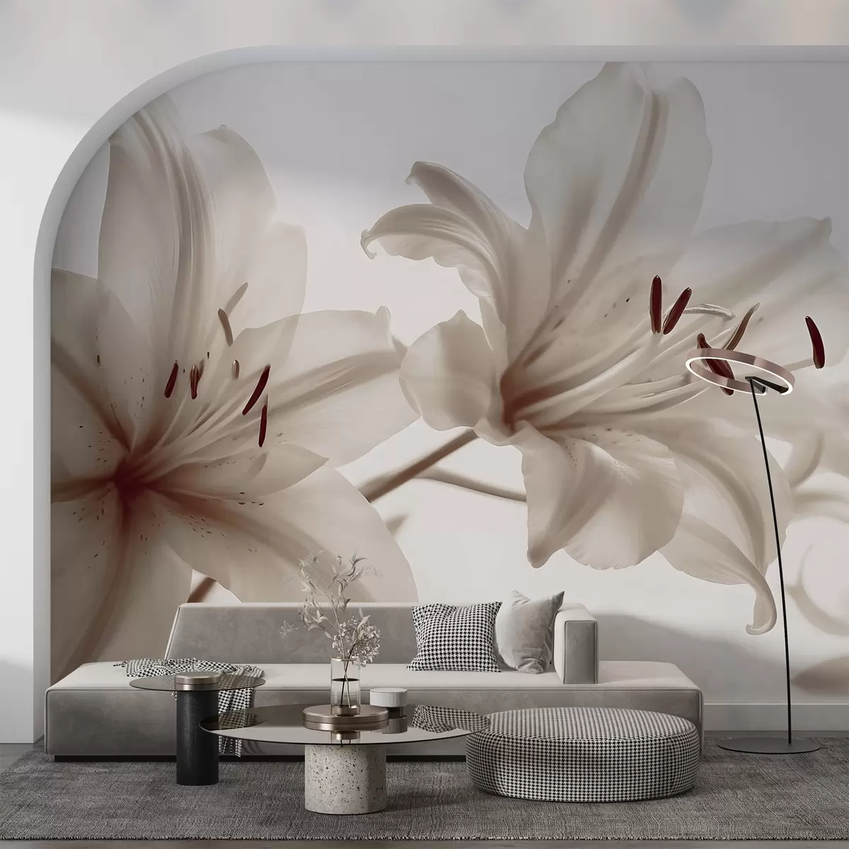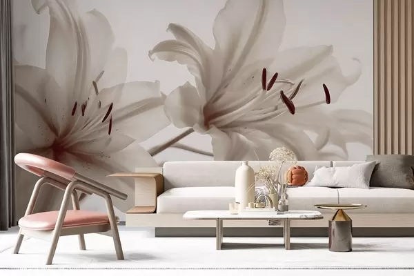 Fotobehang Zachte focus close-up van beige minimalistische leliebloemen tegen een lichte achtergrond N° w08586v1