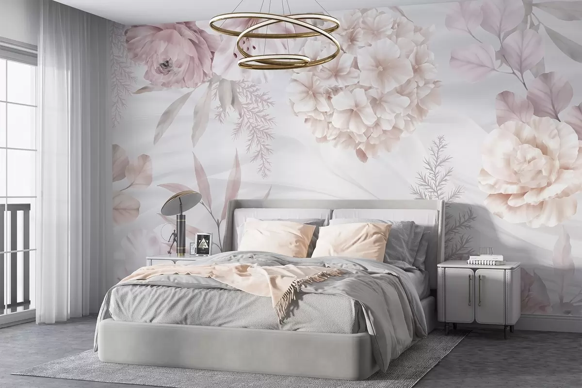 Fotobehang Een zachte, abstracte bloemenprint met grote roze en witte bloemen, delicate bladeren en een gedempt pastelkleurenpalet N° w08651