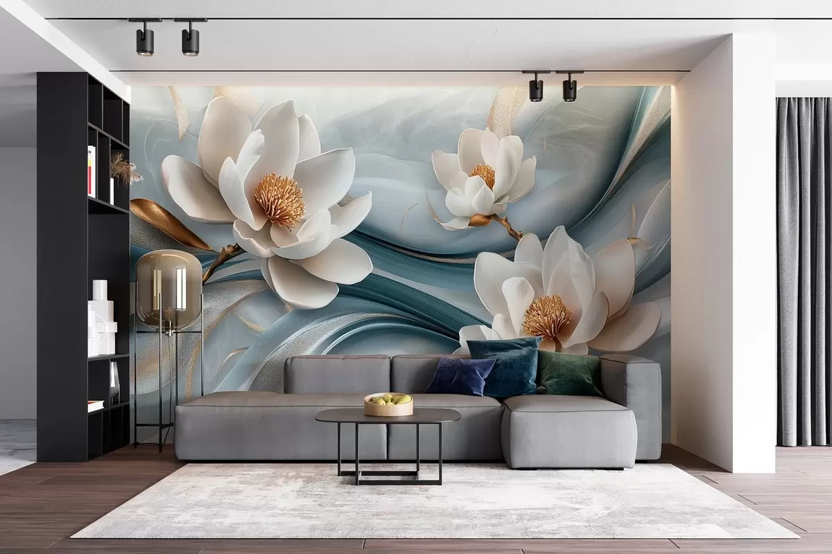 Fotobehang Magnolia bloemen gecombineerd met blauwe, witte en gele tinten met abstracte golven N° w08695