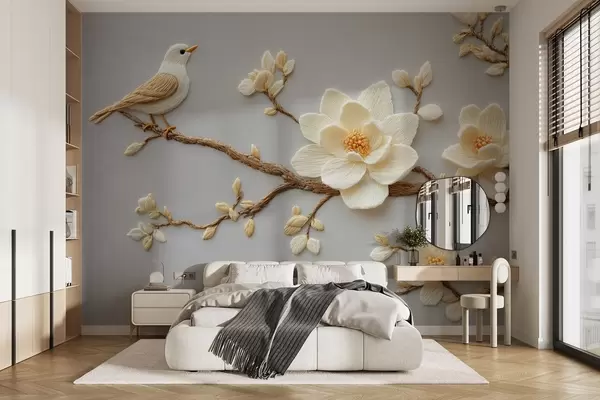 Fotobehang In de stijl van geborduurde magnoliabloemen met een vogel op een tak op een lichtblauwe achtergrond N° w08724