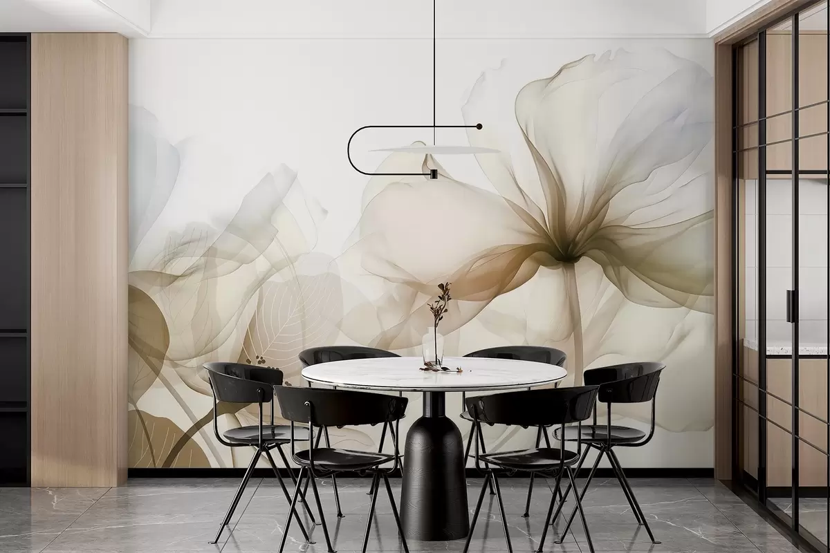 Fotobehang Bruine abstracte bloemen met zachte, doorschijnende bloemblaadjes en fijne details, tegen een witte achtergrond N° w08742v1