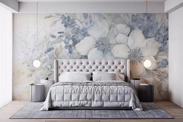 Fotobehang Een zachte muurimitatie met textuur van witte en blauwe bloemen, tegen een bleke achtergrond met vage handgeschreven tekst N° w08771
