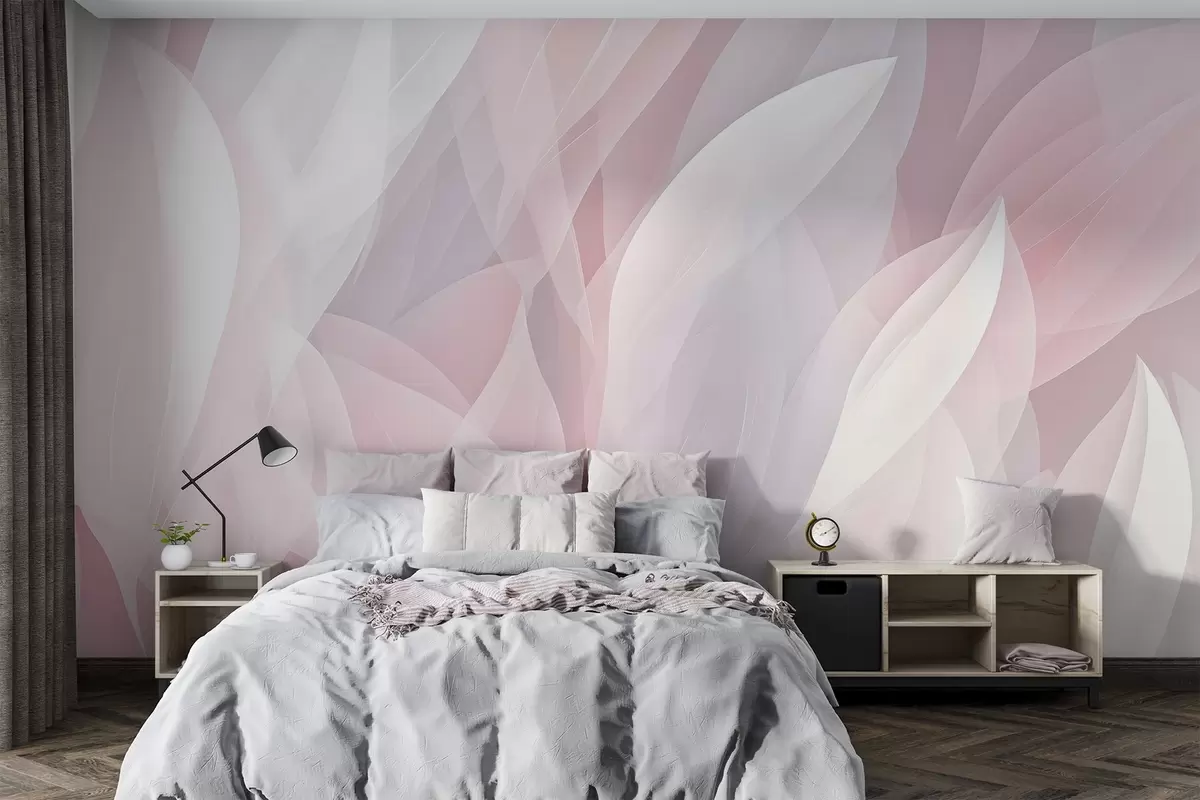 Fotobehang Abstract ontwerp met zachte bloembladachtige vormen in roze en witte tinten, waardoor een gelaagd effect ontstaat N° w08774