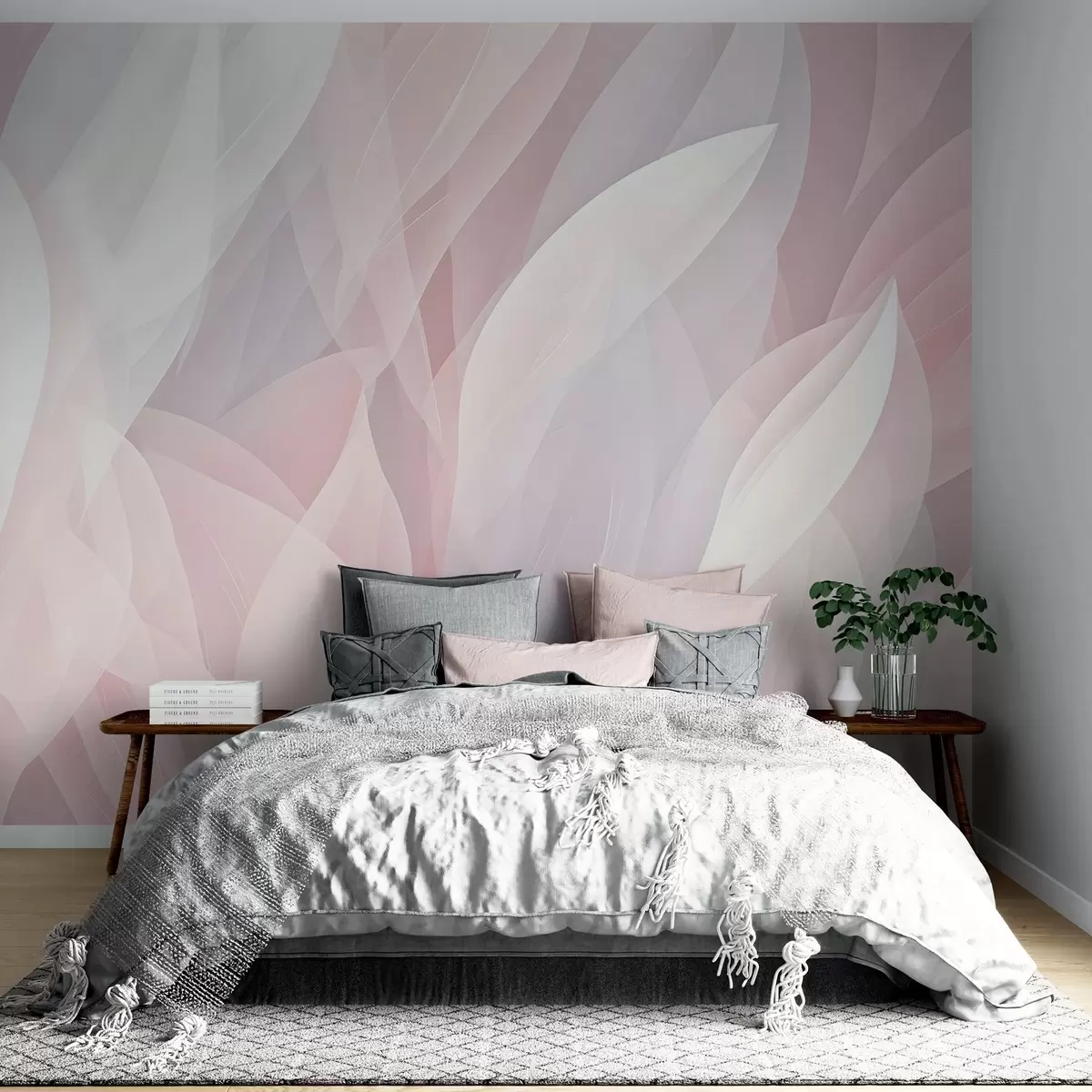 Fotobehang Abstract ontwerp met zachte bloembladachtige vormen in roze en witte tinten, waardoor een gelaagd effect ontstaat N° w08774