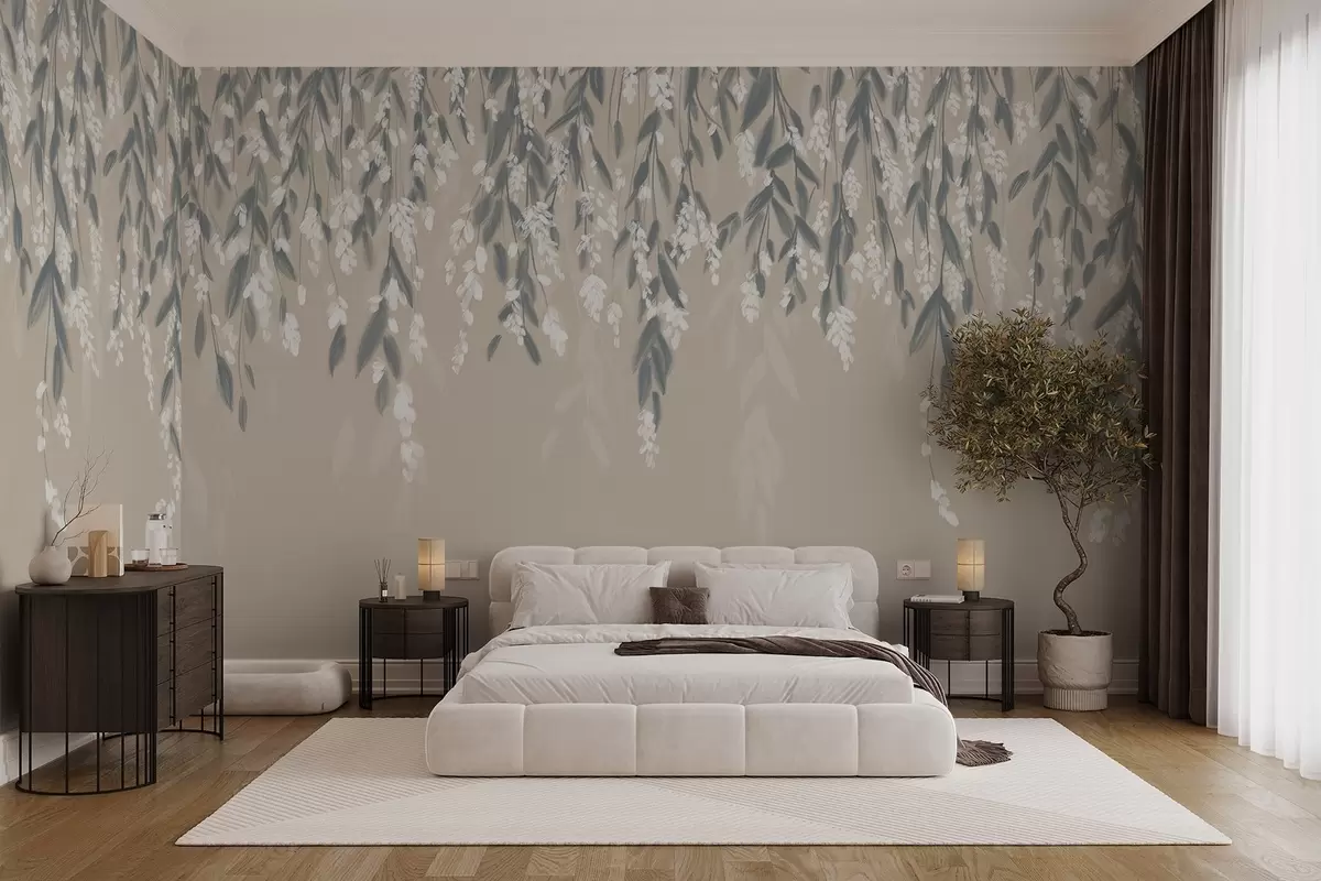 Fotobehang Cascading gebladerte takken in tinten van gedempt groen met witte bloemen en bladeren op beige achtergrond N° w08781