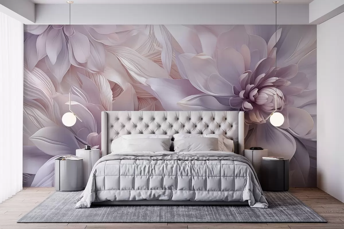 Fotobehang Zachte, gelaagde bloemen in lichtroze, lavendel en witte tinten met delicate bloemblaadjes en ingewikkelde details N° w08783