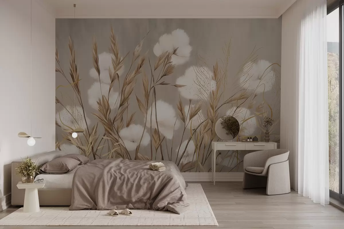 Fotobehang Zachte, pluizige katoenen witte bloemen en hoge oranje aartjes tegen een beige achtergrond met zachte structuur N° w08784