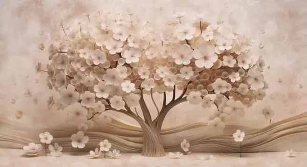 Fotobehang Abstracte boom met kleine bloemen op de achtergrond van een oude muur N° w08794