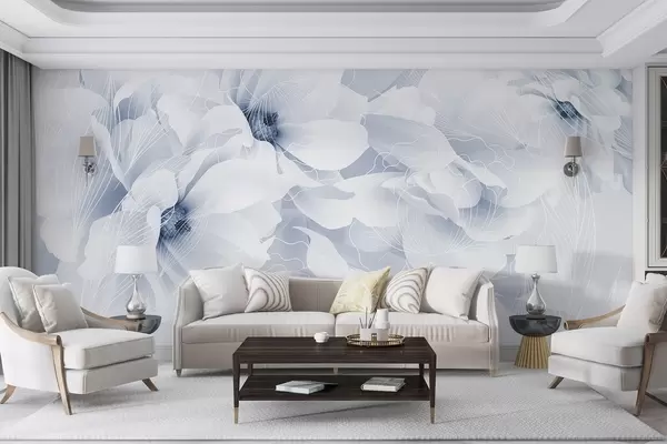 Fotobehang Pastel pioenbloemen met witte en blauwe fijne bloemblaadjes en witte lijnen op een lichtblauwe achtergrond N° w08826