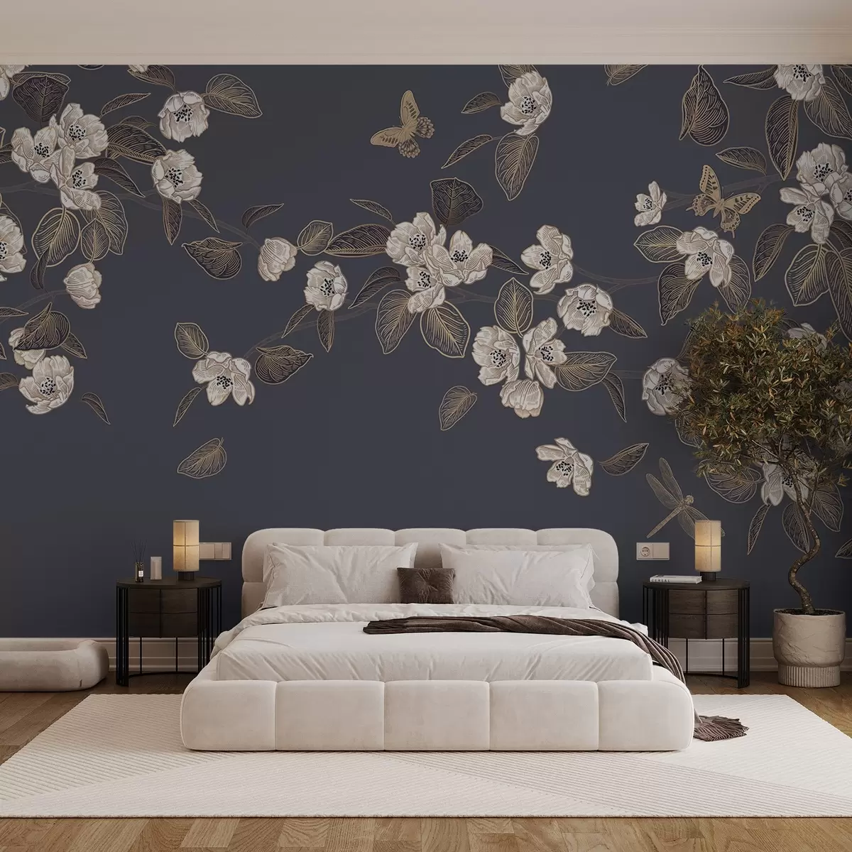 Fotobehang De bloesemtak van de kersenboom met bloemen, bladeren, vlinders op een donkergrijze achtergrond N° w08830
