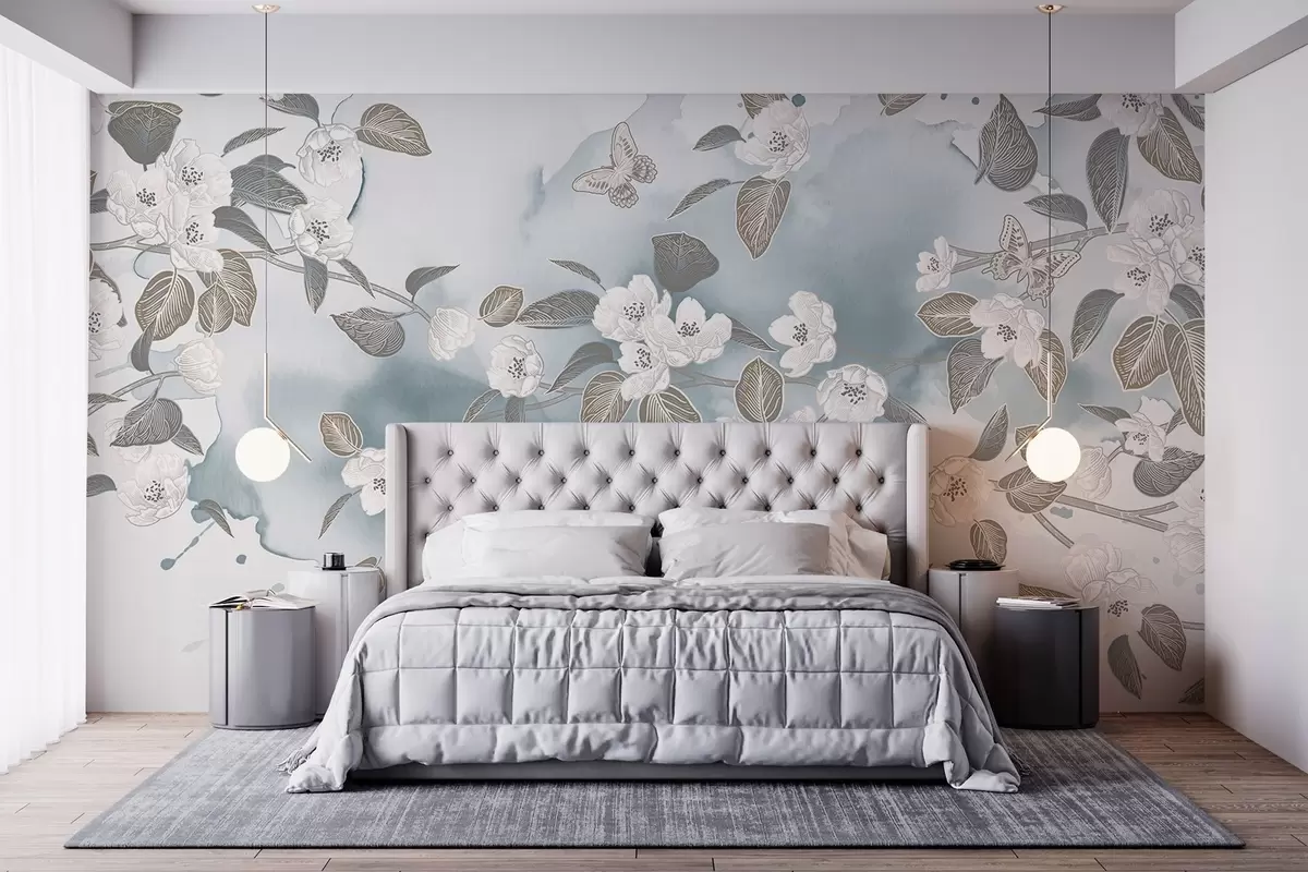 Fotobehang De bloesemtak van de kersenboom met bloemen, bladeren, vlinders op een lichtblauwe aquareltextuurachtergrond N° w08831v1