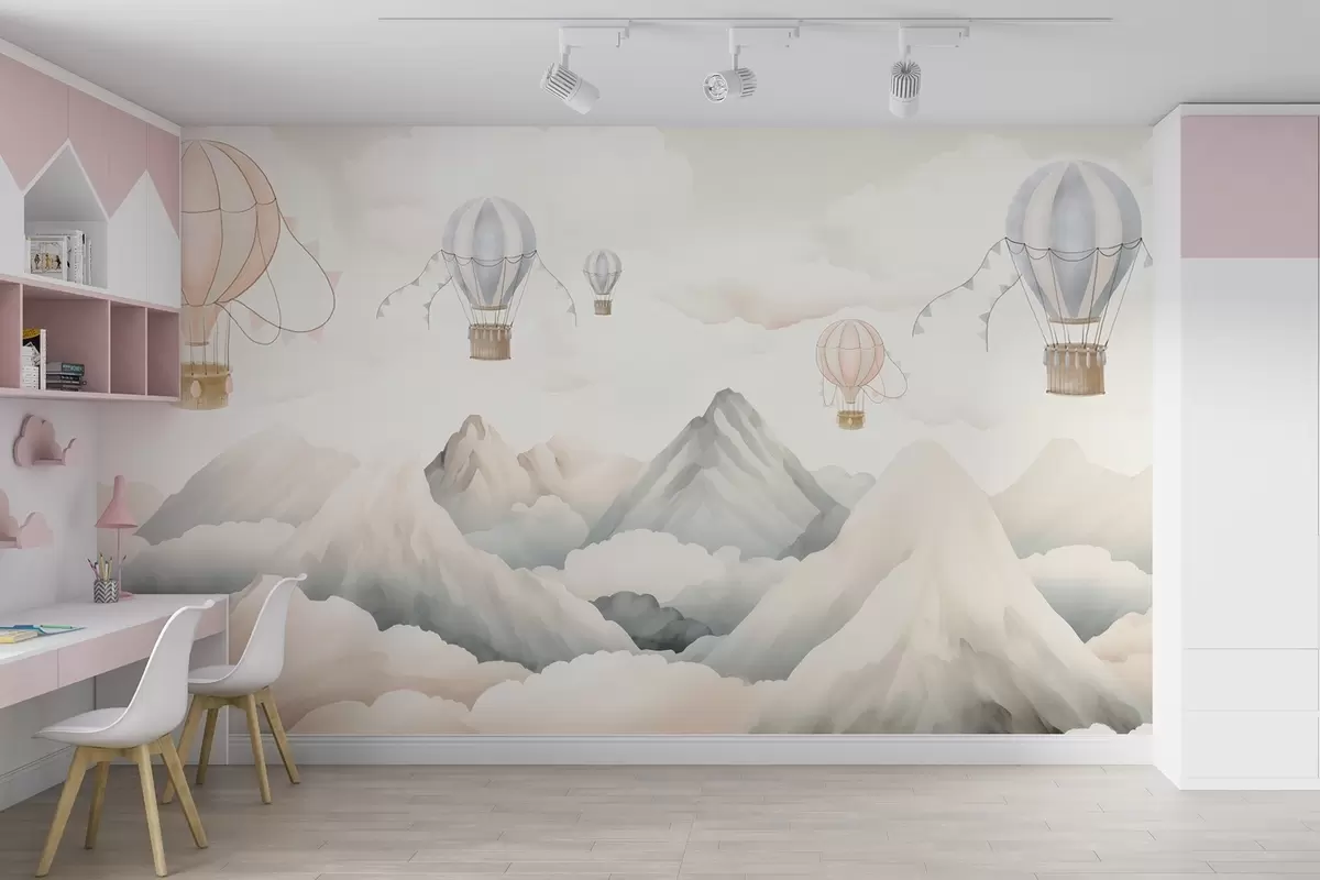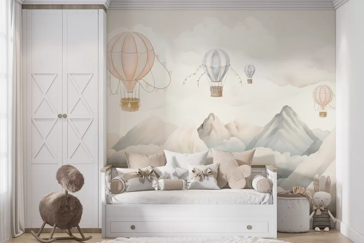 Fotobehang Luchtballonnen zweven boven bergen in neutrale, zachte pasteltinten N° w08853
