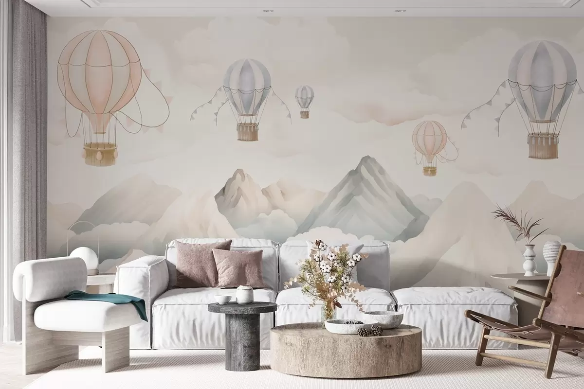 Fotobehang Luchtballonnen zweven boven bergen in neutrale, zachte pasteltinten N° w08853