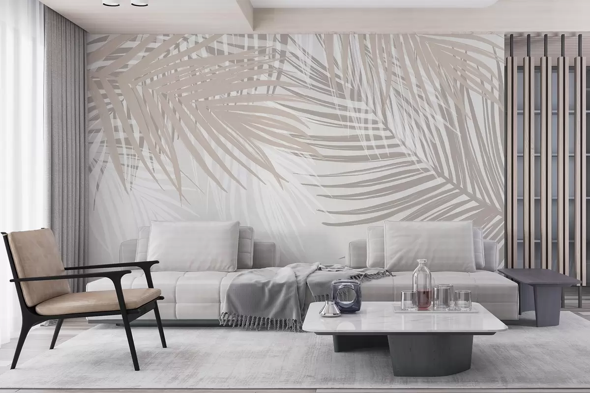 Fotobehang Palmbladeren in lichtbeige en witte tinten, tropisch gebladerte, zachte pastelkleuren, minimalistisch ontwerp N° w08869